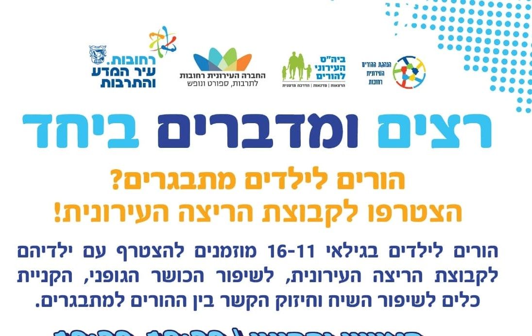 מיזם עירוני חדש ברחובות בנושא הכושר הגופני! ביוזמת חברת המועצה אורית שרגאי, יפתחו קבוצות ריצה עירוניות משותפות להורים ובני נוער בגילאי 11-16 לחיזוק הכושר הגופני והקשר בין ההורים למתבגרים; עלות: 780 ₪ להורה וילד ל12 מפגשים להרשמה: 08-9459397