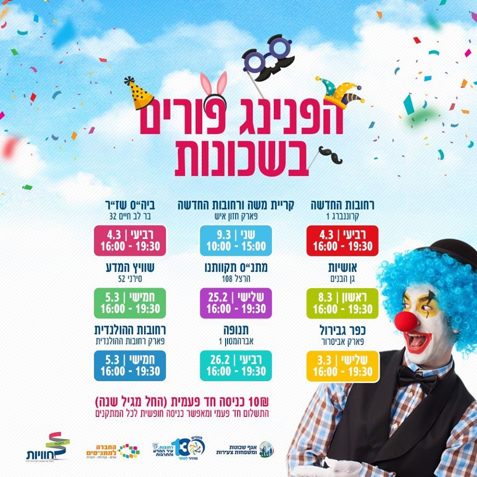 האירועים יערכו בשעות אחר הצהריים במוקדים הבאים (למעט אירוע פורים בקריית משה):