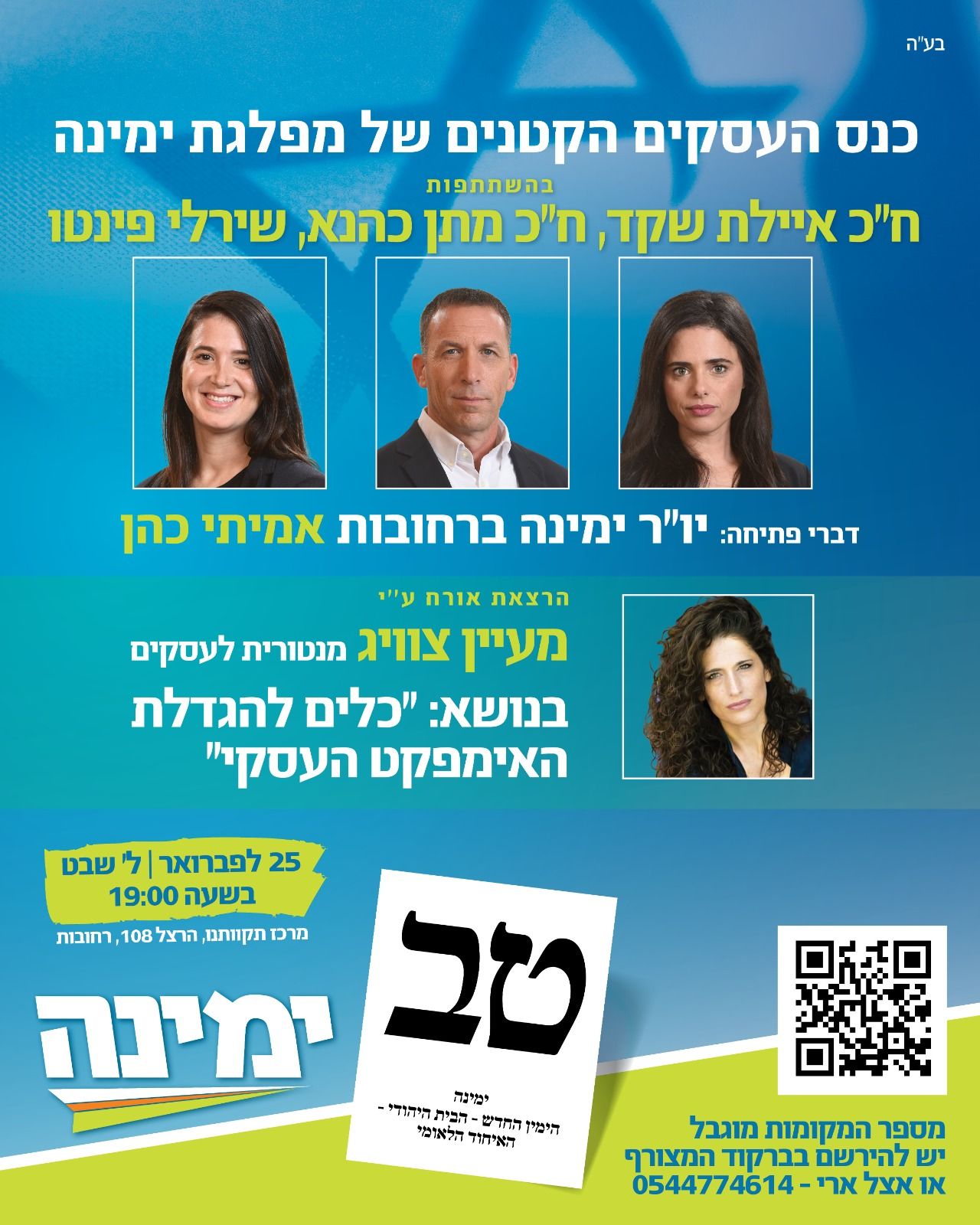 ביום שלישי 25/2 בשעה 19:30 במרכז תקוותנו ברחוב הרצל 108 ברחובות תקיים מפלגת ימינה את "כנס העסקים הקטנים של מפלגת ימינה" בהשתתפות ח"כ איילת שקד, ח"כ מתן כהנא ושירלי פינטו .