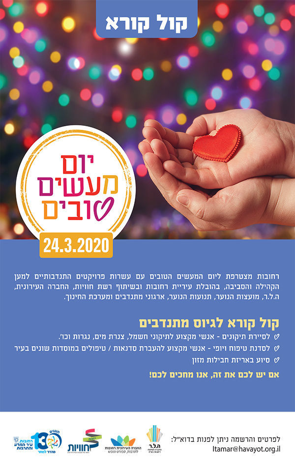 דרושים/ות מתנדבים/ות ליום המעשים הטובים! עיריית רחובות יוצאת בקול קורא לתושבים המעוניינים להתנדב ביום המעשים הטובים 24/3 לסיירת התיקונים (אנשי מקצוע), העברת סדנאות יופי וטיפוח ואריזות חבילות מזון... מייל הרשמה בכתבה