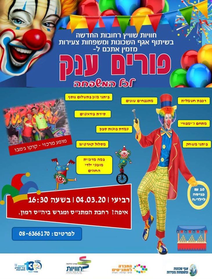 אירועי פורים בשכונות רחובות נמשכים! היום (רביעי 4.3) יתקיים הפנינג פורים ברחובות החדשה עם מתקנים, הפעלות, מתנפחים ועוד