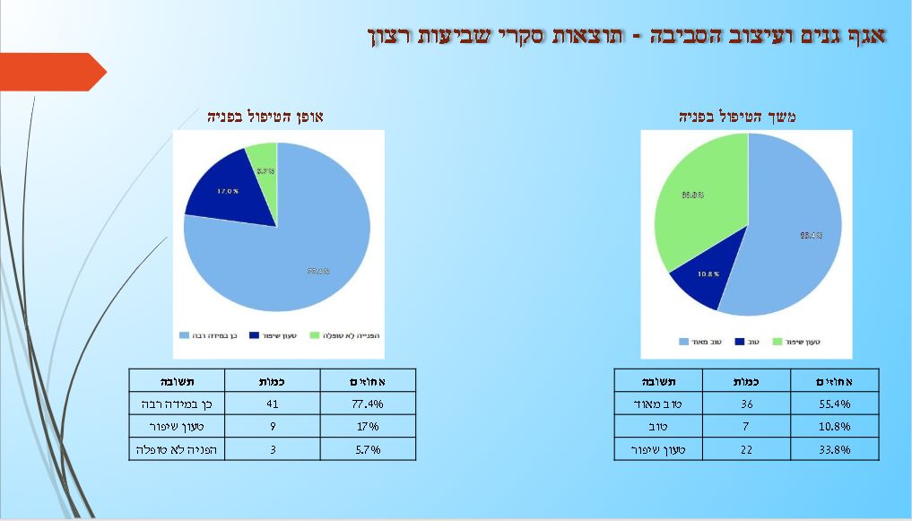 "החלטנו לנהוג בשקיפות ולפרסם את הנתונים. למהפכה שאנחנו מובילים בשטח יש גם בסיס איתן בעובדות. הנתונים האלה מעודדים ומעניקים את הדחיפה לצוותי העובדים והמנהלים בשטח להשתפר עוד יותר . אנחנו שמחים שהתושבים מביעים שביעות רצון אך זוהי רק תחנה נוספת בדרך לשיפורים נוספים ועליה נוספת באחוזי שביעות הרצון של התושבים ובעשייה בשטח בתחומים אלה. זוהי המטרה שהצבנו לנו בקדנציה הזו: להיות טובים יותר בתחום חזות העיר ונגישים יותר לתושבים ואנו נעמוד ביעדים אלה"