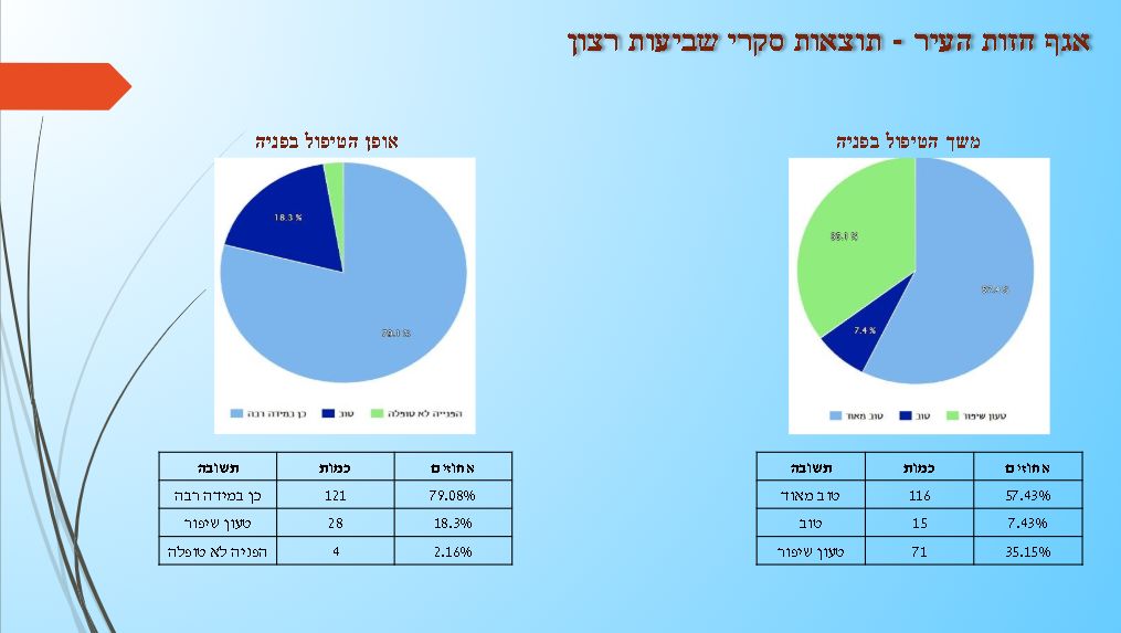 כעת, עם סיום הפיילוט בתוכנה החדשה של המוקד העירוני, המאפשרת מדידה איכותית יותר של הטיפול בפניות וכן סקרי שביעות רצון של התושבים – התמונה מתבהרת ואף מאפשרת להשתפר עוד יותר .