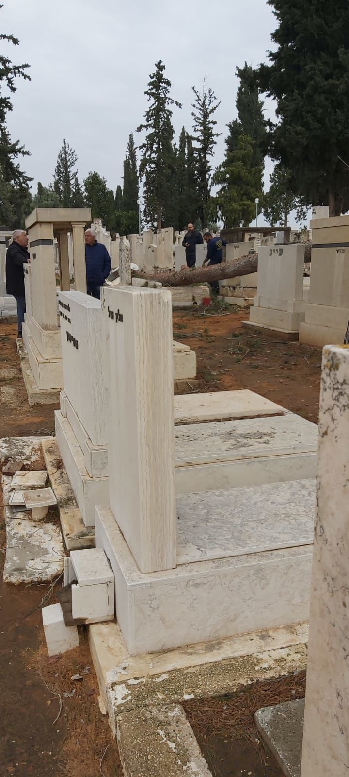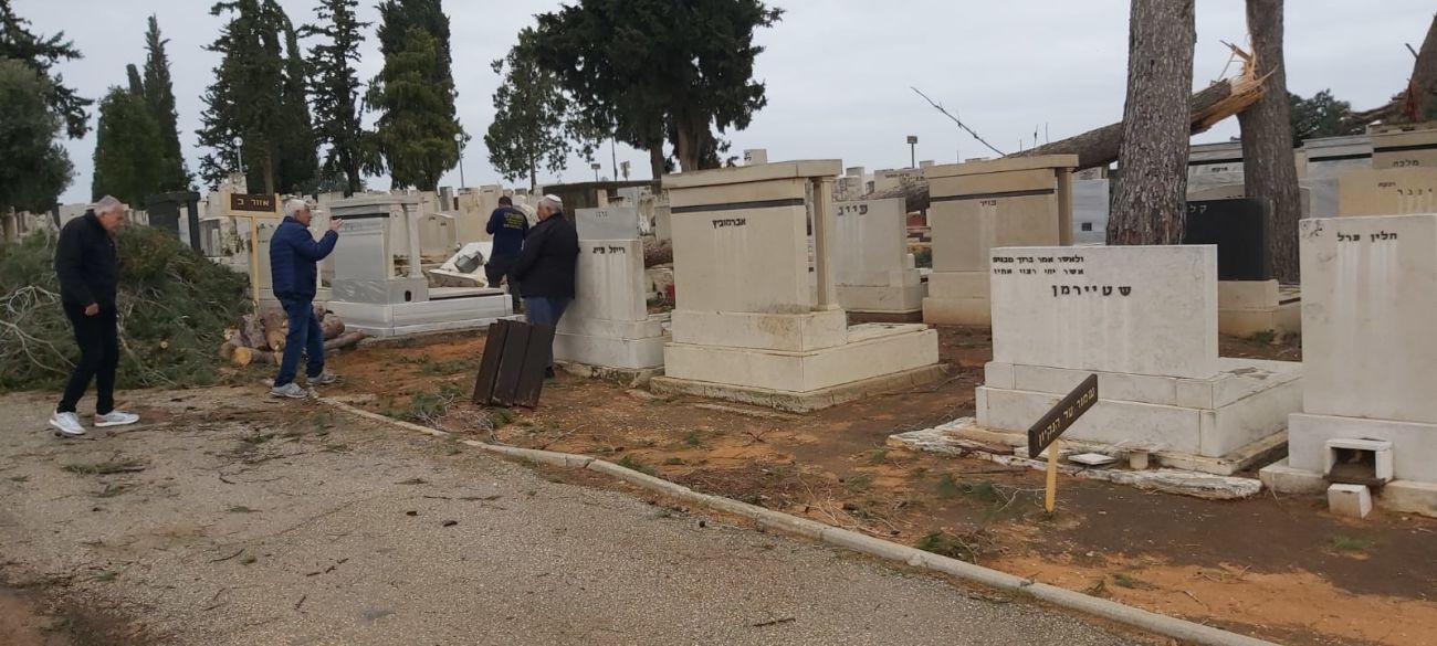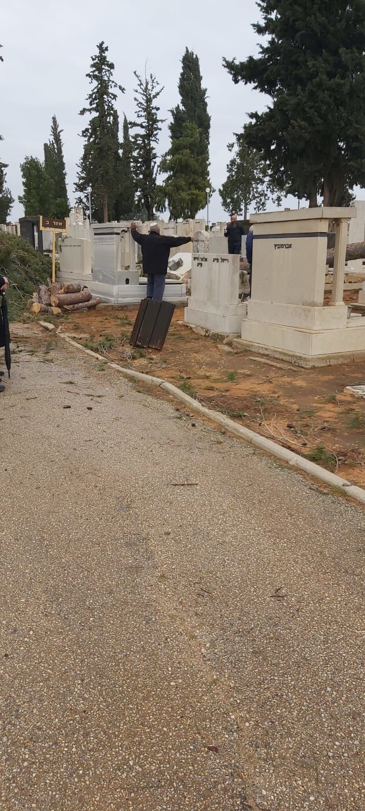 היום שישי 13/3 עובדי חברת קדישא אשר הגיעו לבית העלמין גילו כי הסופה ניפצה מצבות, עצים קרסו וישנם עצים העומדים בפני קריסה.