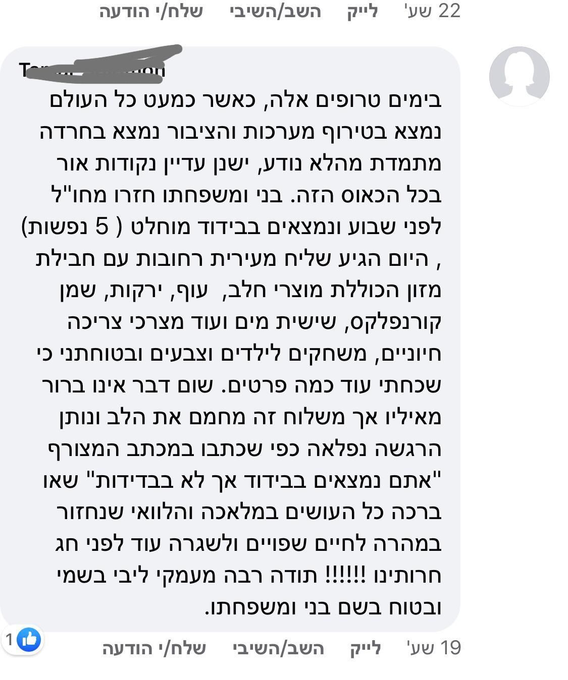 " זו ישראל היפה .בימים הקרובים נמשיך לחלק ערכות למבודדים בהתאם למידע שנקבל. אנחנו רואים את הערבות ההדדית כערך עליון, ונמשיך לעזור ולסייע ככל שניתן. זה המקום להודות לראש העיר מר רחמים מלול ,לחבר המועצה אמיתי כהן שסייעו ונתנו למהלך החשוב הזה להתממש. כמו כן למנהל אגף השכונות רמי מדהלה, לסגן מנהל אגף השכונות אופיר עותמי ,לערן גדסי למנהל הבית החם איתי גדקה ולכל הצוות שעושים ימים כלילות בכדי לעמוד במשימה החשובה הזאת ולפעילי שכונות על ההירתמות והתנדבות אני מודה מקרב לב"