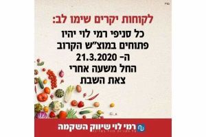 רשת המזון רמי לוי הודיע כי כל סניפי הרשת יהיו פתוחים לרווחת הקהל במוצ"ש 21.3.20. הסניפים בראשון לציון, רחובות ובת ים יהיו פתוחים לקהל החל משעה לאחר צאת השבת.