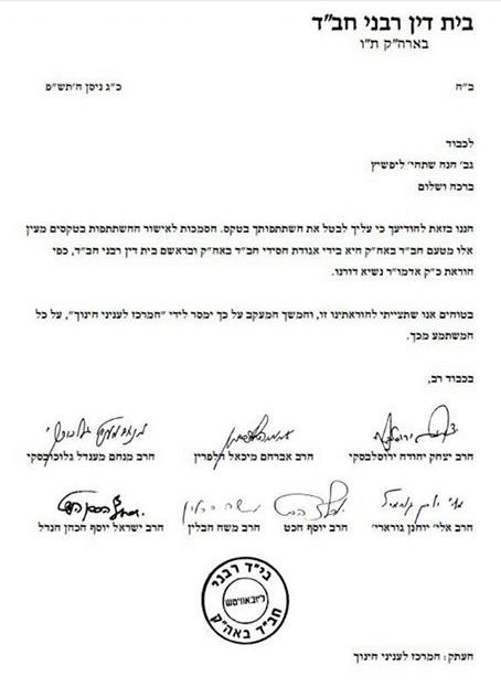 המכתב שקבלה חני מרבני חב"ד