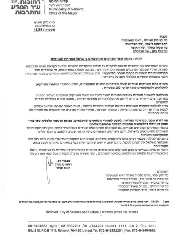 "ההחלטה להשאיר סופרים צפופים פתוחים ומנגד לנעול את שערי השווקים הפועלים באוויר הפתוח, מסבה נזקים כלכליים כבדים לסוחרים" כתב להם .