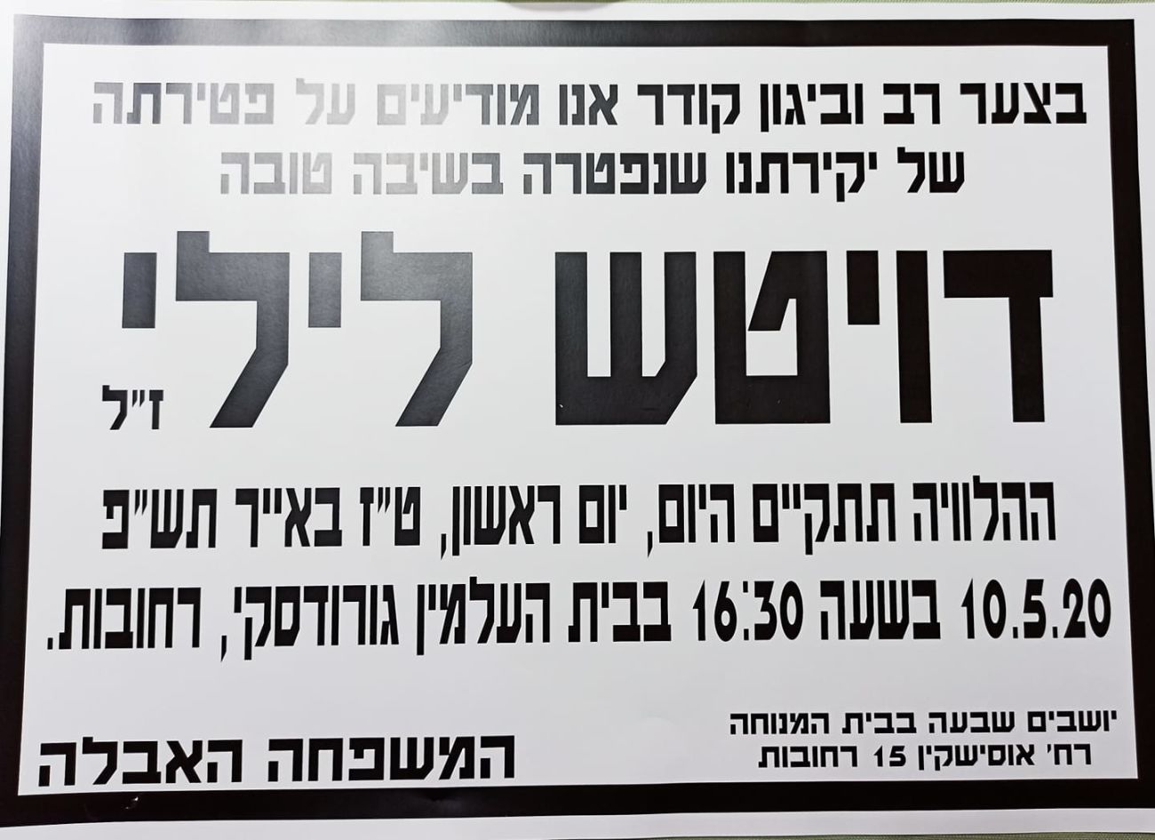 יושבים שבעה ברחוב אוסישקין 15 ברחובות בין השעות 10.00-19.00.