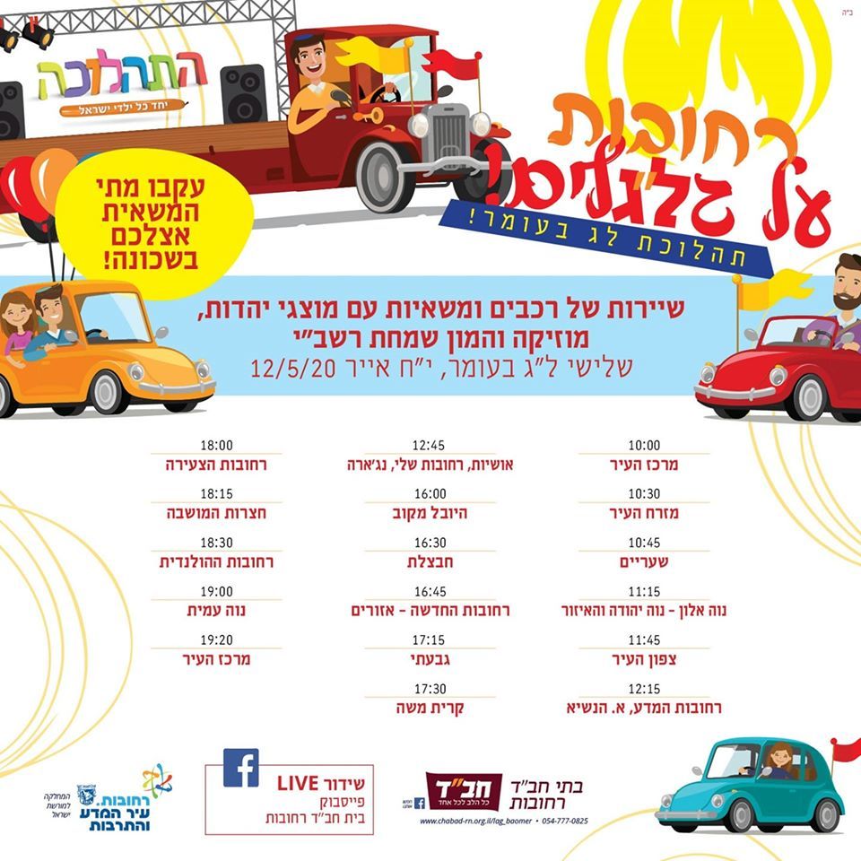 מחר (שלישי 12.5) יצויין ל"ג בעומר שיהיו ללא המדורות המסורתיות של החג. למרות ההגבלות בבתי חב"ד של רחובות מתכוננים לערוך את התהלוכה המסורתית של ל"ג בעומר שתסתובב ברחבי העיר : רחובות המדע, רחובות החדשה, שכונת יובל ועוד. על פי התכנון תסתובב ברחבי השכונות משאיות חב"ד עם מוזיקה במיוחד לתושבים שיכולים להצטרף לחגיגה דרך המרפסות.