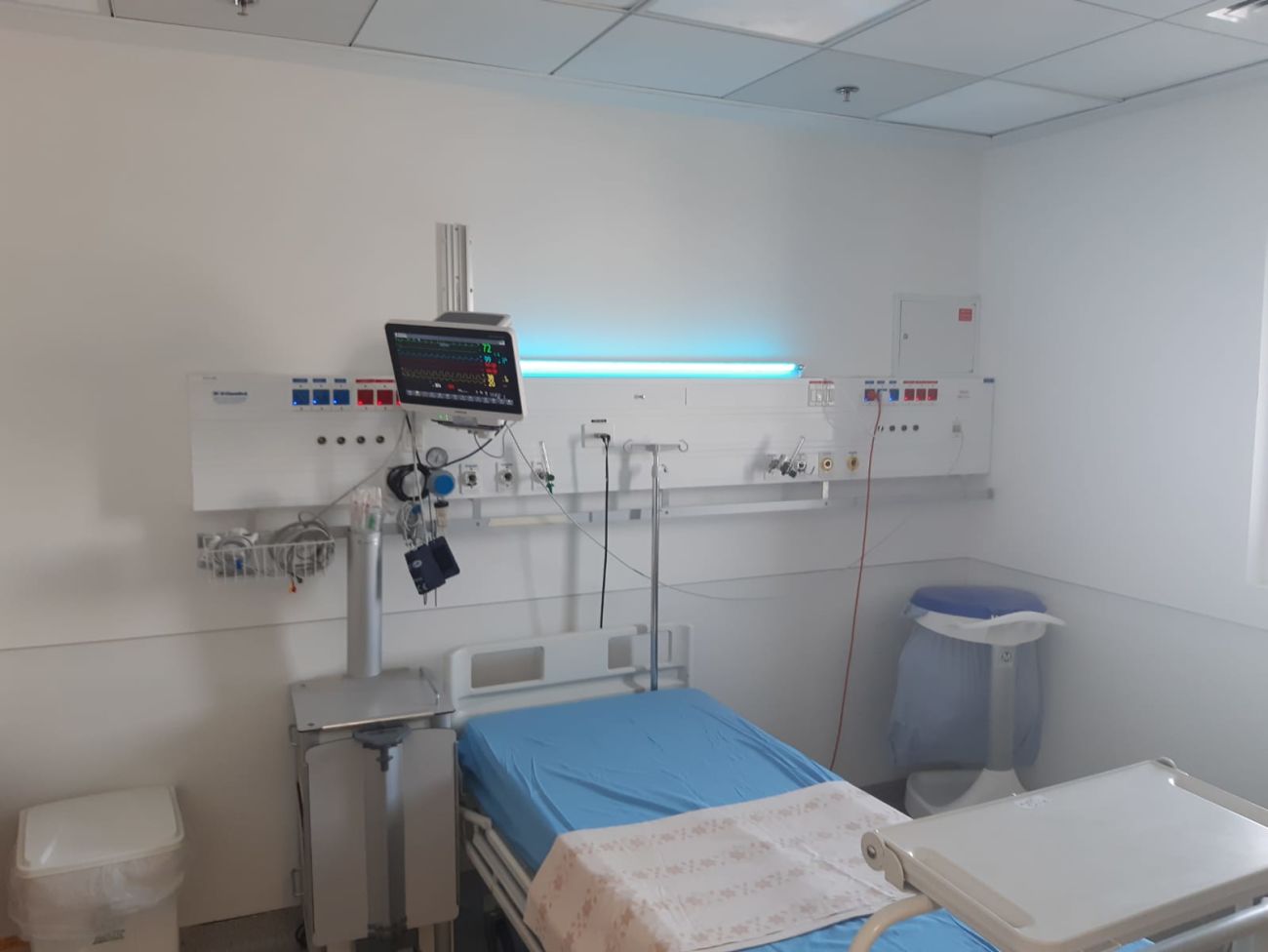 "במחלקה המטפלת בחולי קורונה מותקנת כעת מערכת לחיטוי בעזרת מנורות הפולטות אור אולטרה סגול. אלה נורות מיוחדות הפולטות אור בתדירות שאינה גורמת להיווצרות אוזון באוויר, ובכך הן בטוחות לשימוש גם בחדרים בהם נמצאים חולים מונשמים. הפעלת המנורות גורמת להשמדה של מיקרואורגניזמים, כולל חיידקים ווירוסים. הפעלה במשך דקות עד חצי שעה בכל משמרת, מקטינה בשיעור ניכר את הסיכון להדבקה של צוות רפואי וסיעודי המטפל בחולים. במחקרים שנעשו לאחרונה נמצא שקרינה זו גורמת להשמדת וירוס ה-COVID19 על פני משטחים שהוקרנו, לכן בטיחות העבודה של הצוות משתפרת".