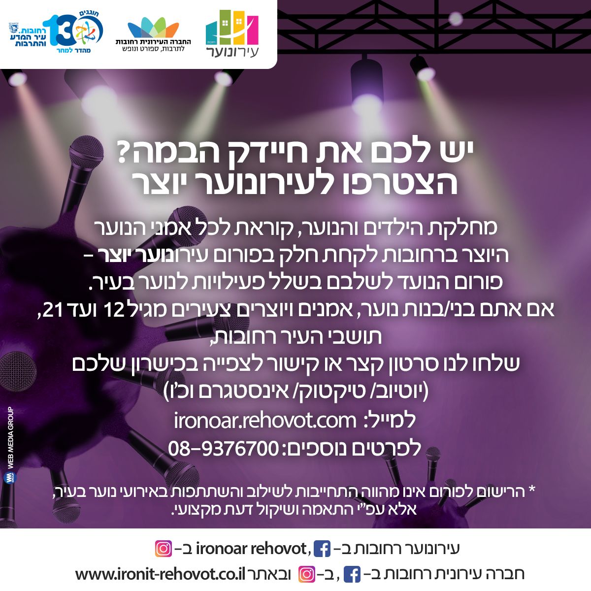 תושבי רחובות בני 12-21 עם כשרון באמנות הבמה? מחלקת הנוער של רחובות מזמינה אתכם לקחת חלק בפורום עירונוער יוצר, המשלב אתכם באירועי הנוער העירוניים