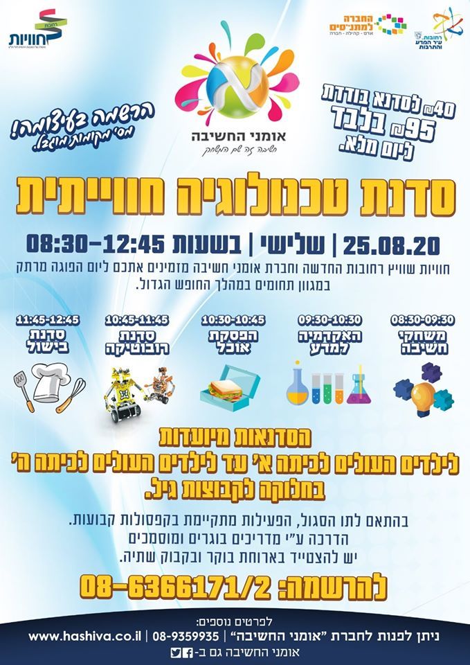 רשת חוויות מזמינה את ילדי רחובות לסדנת טכנולוגיה בת יום אחד שכולה בסימן המדע. הפעילות תתקיים ביום שלישי 25.8.20 בין השעות 8:30-12:45 במסגרתה יכולים ההורים לבחור לילדיהם סדנא אחת או להישאר במשך כל היום. הסדנאות מיועדות לילדי כיתות א ועד ילדים העולים לכיתה ה - על פי חלוקה לקבוצות גיל. את הסדנאות יעבירו מדריכים בוגרים ומוסמכים.