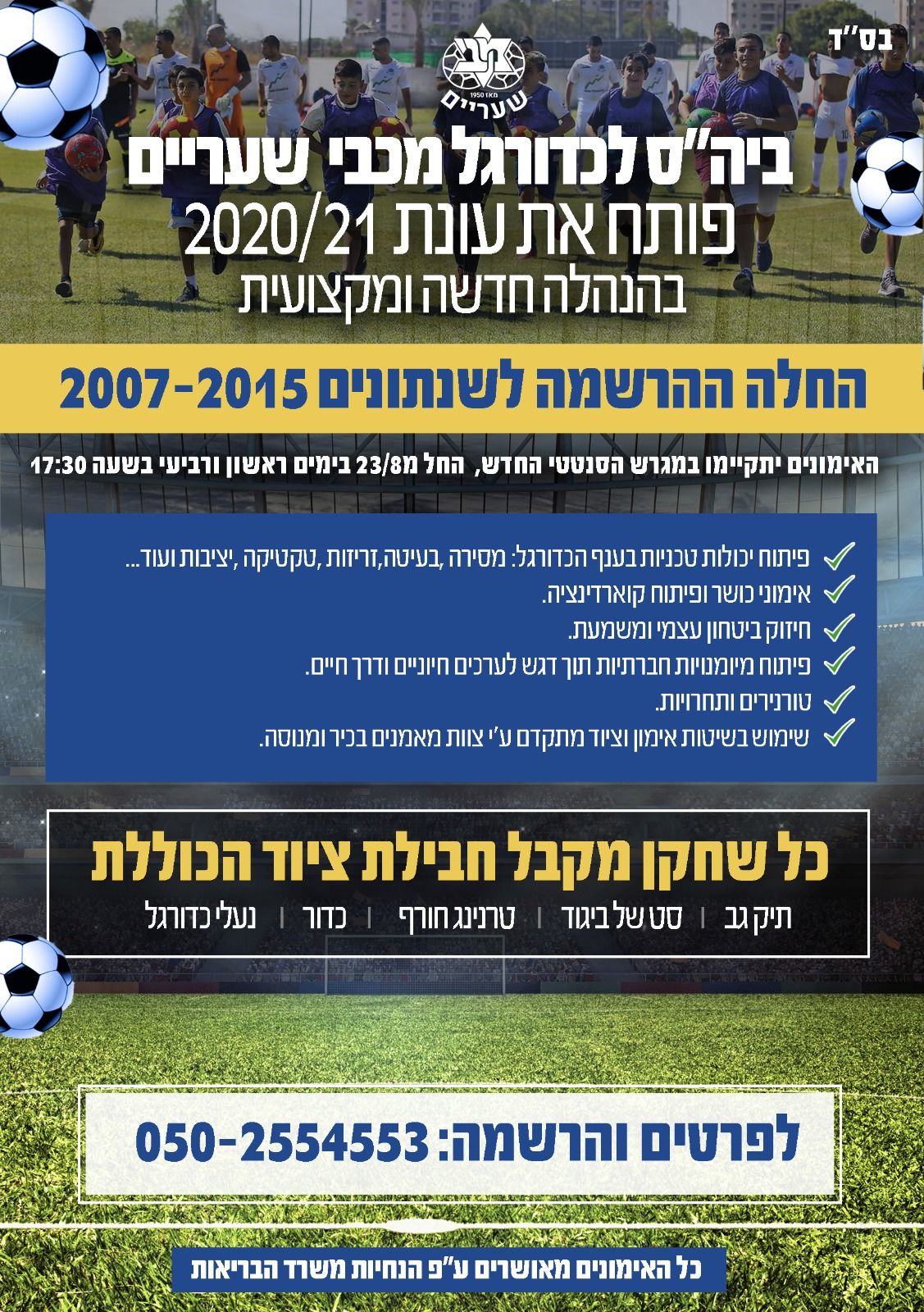 בימים אלו יוצאת קבוצת הכדורגל מכבי שעריים לדרך חדשה לקראת פתיחת עונת המשחקים, 2020/2021 ויחד איתה פותחת שוב את שערי הקבוצה, לילדי מחלקת הילדים והנוער של המועדון. לאחר שמינתה את רון קורפלי, להוביל את מחלקת הילדים והנוער נפתחה בימים אלו ההרשמה לבית הספר לכדורגל לשנתונים 2002-2015.