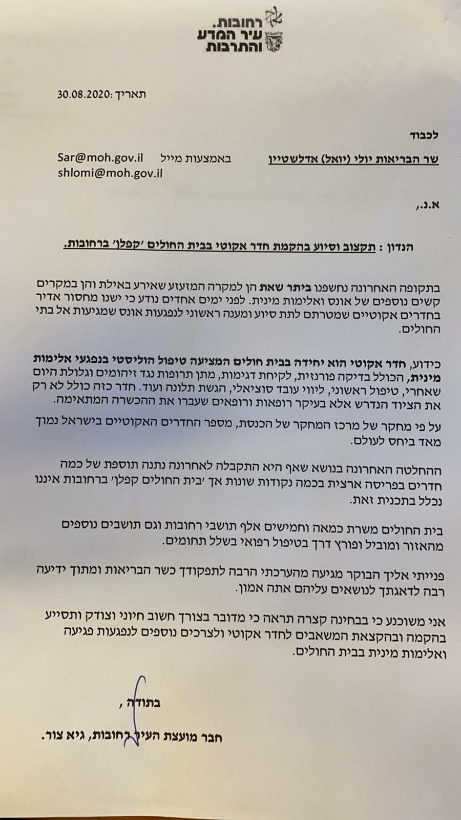 עוד הוא מוסיף:" בית החולים משרת כמאה וחמישים אלף תושבי רחובות וגם תושבים נוספים מהאזור ומוביל ופורץ דרך בטיפול רפואי בשלל תחומים. אני משוכנע כי בבחינה קצרה תראה כי מדובר בצורך חשוב חיוני וצודק ותסייע בהקמה ובהקצאת המשאבים לחדר אקוטי ולצרכים נוספים לנפגעות פגיעה ואלימות מינית בבית החולים."