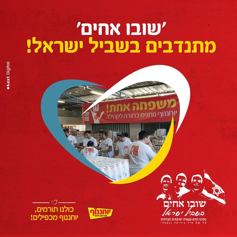 "שמח על שיתוף הפעולה יחד עם רשת יוחננוף והמכינה הקדם צבאית ״שובו אחים״ בפרויקט כולנו משפחה אחת , שגדל משנה לשנה ומקבל משמעות בחג מיוחד זה ובתקופה זו של הקורונה. מודה לכל העוסקים במלאכה ובסוף שמח לראות שבקצה זה מגיע לכל המשפחות הזקוקות לכך."
