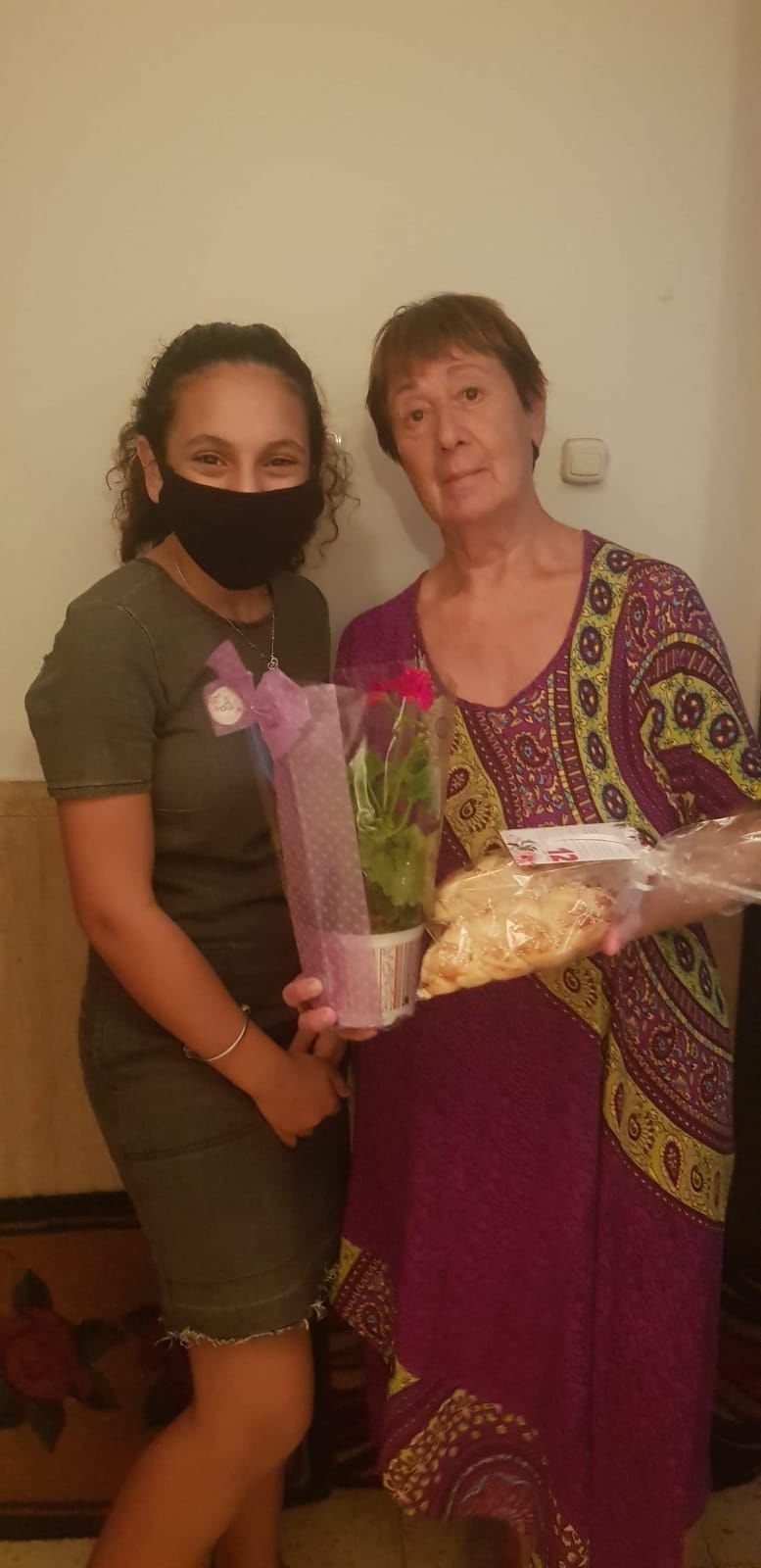 את החלות, 2 לכל משפחה יחד עם עציץ גרניום ריחני חילקה יחד עם משפחתה למשפחות אותן בחרה