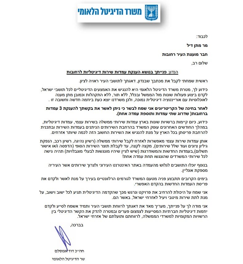 שר הדיגיטל הלאומי ח"כ דודי אמסלם, שלח מכתב תשובה לחבר המועצה מתן דיל כי הוא נענה לבקשתו ויציב ברחבי העיר 3 עמדות דיגיטיליות חדשות אשר יחליפו את 2 הישנות בבניין העירייה ובפארק המדע ועמדה שלישית במיקום חדש עליו תחליט העירייה.