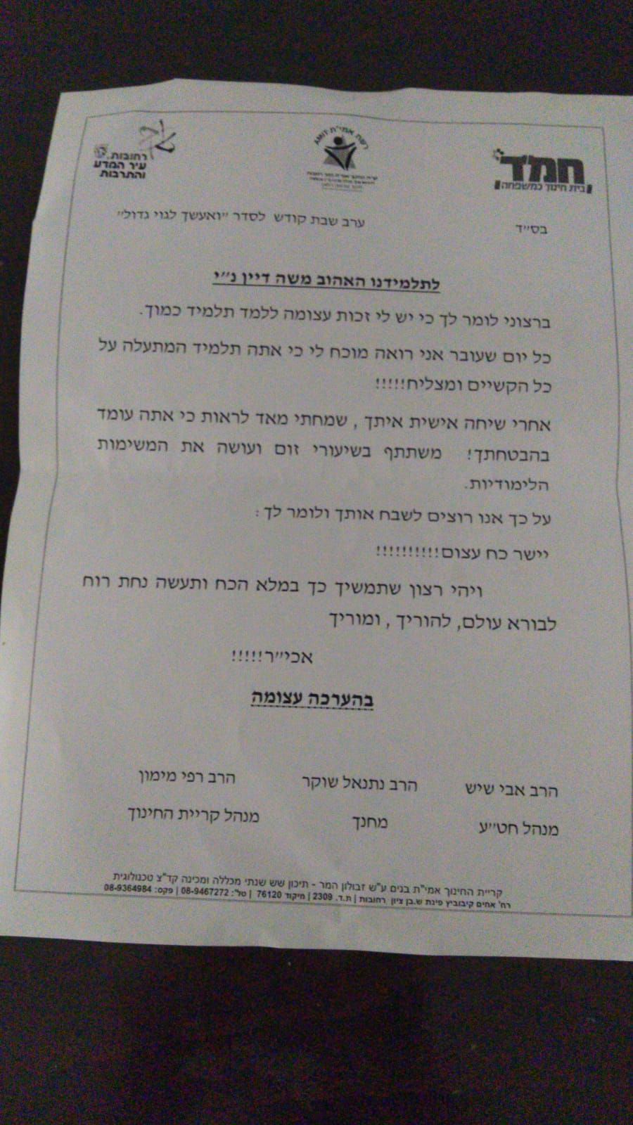 היום שישי 30/10 בשעות הצהריים ציפתה הפתעה מרגשת למשה דיין תלמיד חט"ע המר כאשר בפתח ביתו הופיעו הרב אבי שיש מנהל חט"ע והרב נתנאל שוקר והרב רפי מימון מנהל קריית החינוך וברכו את התלמיד והביעו הערכה על ההשקעה וההתמדה על לימודיו בזום והעניקו לו תעודת הוקרה