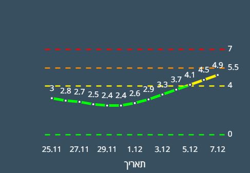 | תאריך | ציון יומי על פי תוכנית הרמזור | חולים חדשים לכל 10,000 איש | אחוז הבדיקות החיוביות | מספר החולים הפעילים |