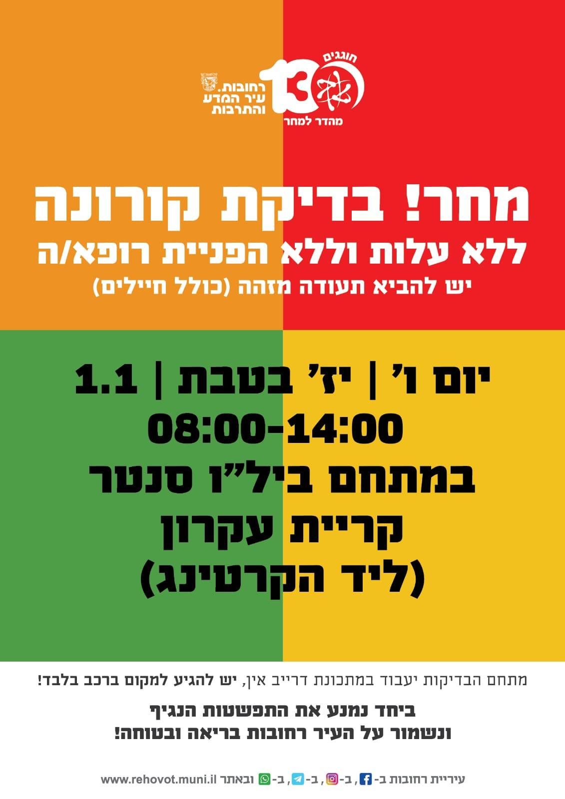 מחר, יום שישי, 1.1 ייפתח מתחם בדיקות ללא צורך בתור ובהפנייה במתחם ביל״ו סנטר בקרית עקרון , ליד הקארטינג . בין השעות 8:00-14:00 וכל תושבי רחובות, כולל חיילים, מוזמנים להגיע ולהיבדק בקלות, ללא הפניית רופא וללא תשלום. יש להגיע עם תעודה מזהה.