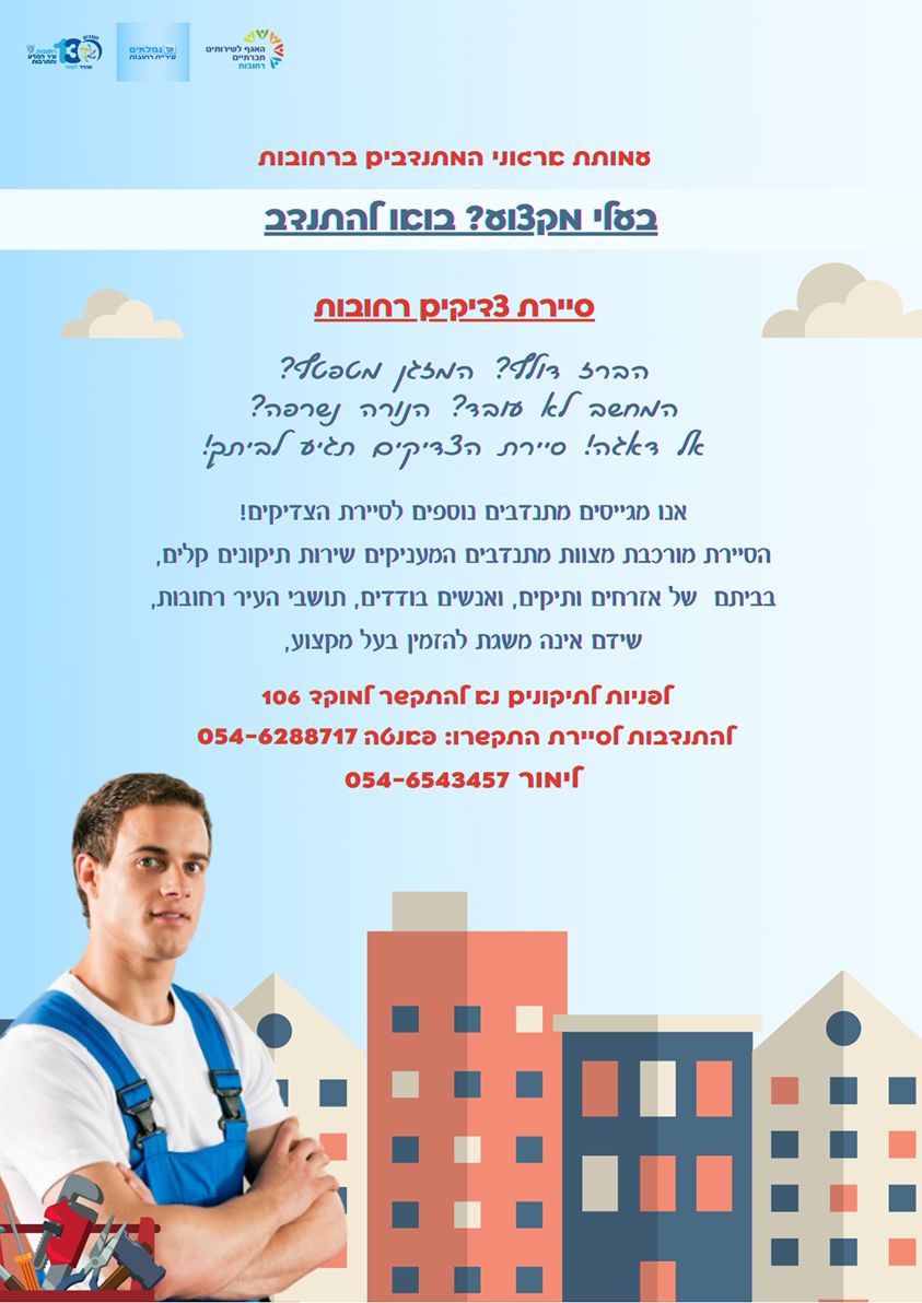 דרושים בעלי מקצוע מתנדבים לסיירת הצדיקים ברחובות שיעניק שירות תיקונים לקשישים בודדים ברחובות; להתנדבות לסיירת ניתן לפנות לפאנטה 054-6288717 או לימור 054-6543457