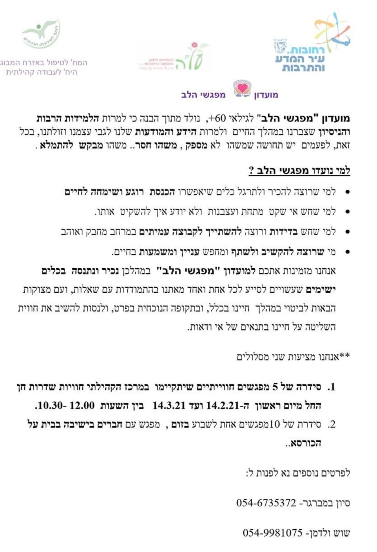 עיריית רחובות בשיתוף בית על"ה מזמינים את האוכלוסייה המבוגרת בעיר להצטרף למועדון מפגשי הלב המיועד לבני 60+. מועדון מפגשי הלב נועד להכיר ולהתנסות בכלים ישימים שעשויים לסייע לכל אחד בהתמודדות עם שאלות ועם מצוקות הבאות לידי ביטוי במהלך חיינו ולנסות להשיב את חווית השליטה על חיינו כאשר אנו חשים אי וודאות. במסגרת המועדון יתקיימו מפגשים בין החברים בזום/ במתנ"ס חוויות שד' חן.