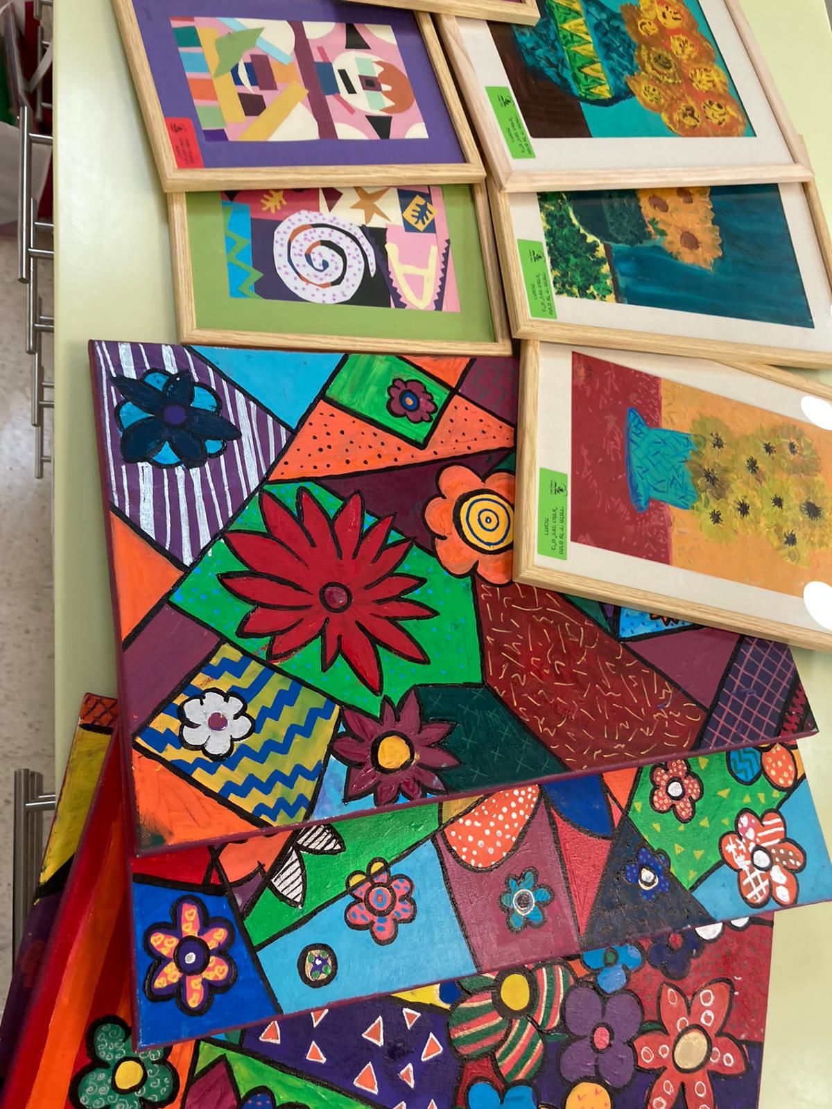מנהלת ביה"ס והמורה לאומנות הגיעו עם עשרות ציורים ויצירות אמנות שהכינו הילדים, קנבסים עם צבעי אקריליק, יצירות מנגזרות נייר, יצירות בצבעי שמן ואף ערכות להכנת יצירות נייר בהשראת הצייר מאטיס לטובת המטופלים עצמם.
