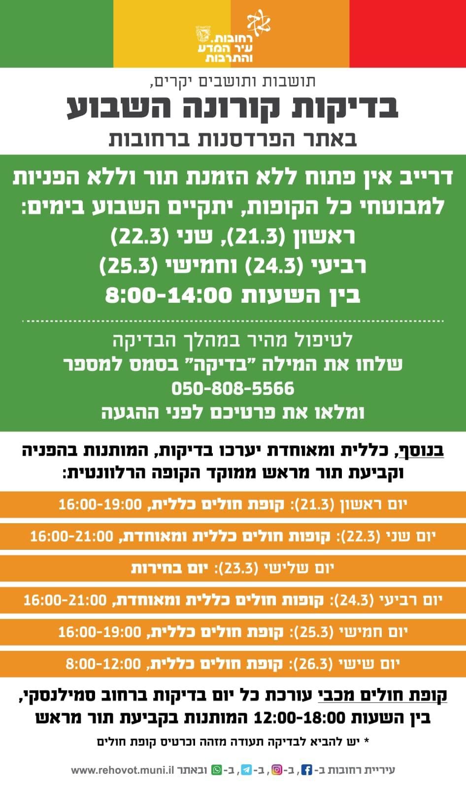 להלן טבלת בדיקת הקורונה לשבוע הקרוב 21/3 - 25/3