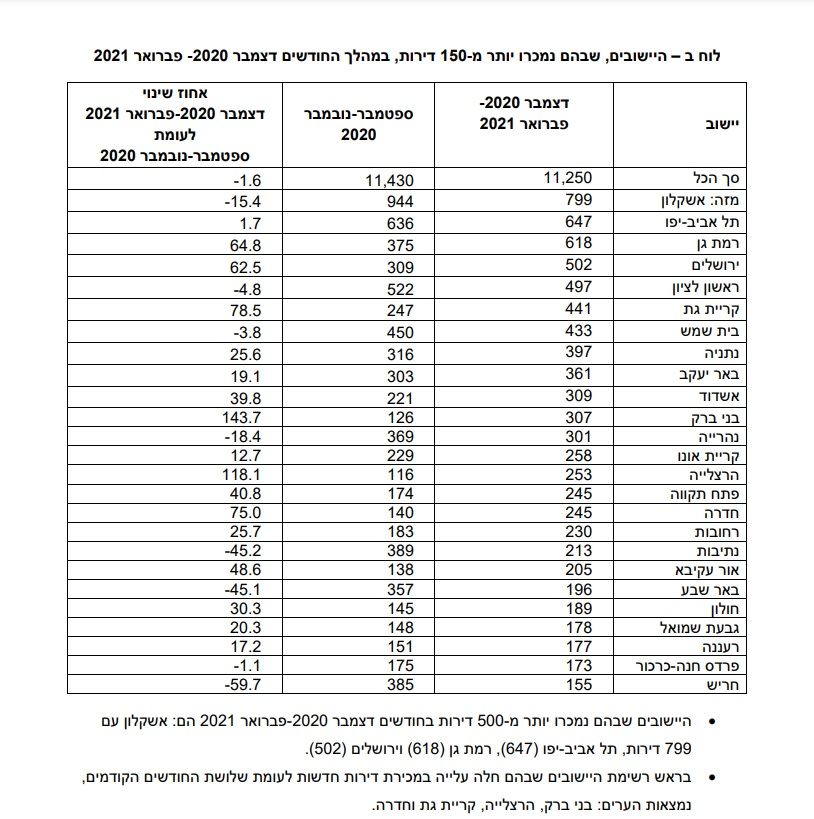 ב - 3 החודשים האחרונים דצמבר - פברואר 2021 נמכרו 230 דירות חדשות וב - 3 החודשים הקודמים ספטמבר - נובמבר 2020 נמכרו 183 דירות.