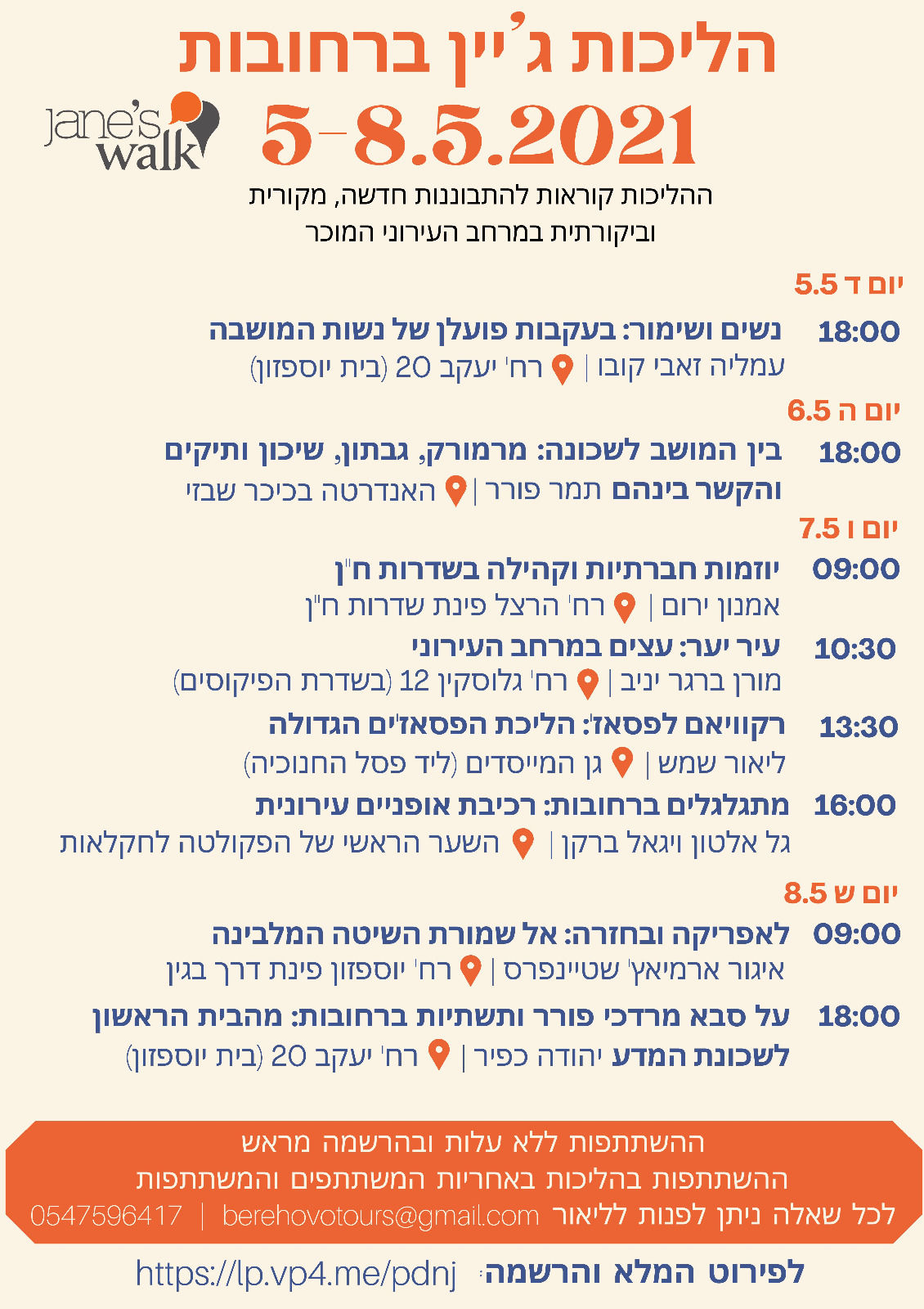 פעילות פסטיבל הליכות ג'יין ברחובות! בימים רביעי-שבת 5-8.5 יחלו אירועי הפסטיבל הכוללים סיורי ברחבי העיר, רכיבת אופניים, לימוד על טבע ויזמות עירונית והכל ללא עלות