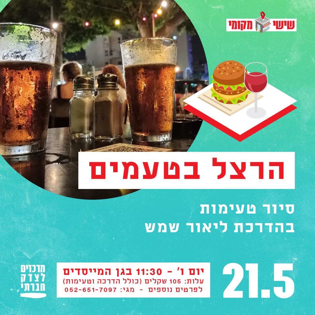 המרכז לצדק חברתי מזמינים את התושבים לפעילות "שישי מקומי" סיורי תרבות, אמנות וטעימות ברחבי העיר המתקיים מדי יום שישי, למען ובשיתוף מורי דרך והעסקים המקומיים. למרות ההקלות, המשבר הבריאותי והכלכלי פגע אנושות בעסקים המקומיים ובעובדי תעשיית התיירות שמנסים לשרוד את התקופה הקשה. לאור המצב המרכז לצדק חברתי ברחובות ניסה לסייע ויזם את 'שישי מקומי' במסגרתו ערכו בחודשים האחרונים סיורים מודרכים בשיתוף עסקים ומורי דרך מקומיים. בין היתר ערכו סיורים היסטוריים, סיורי טעימות בין מסעדות מוכרות בעיר, סיורי אומנות וקהילה.