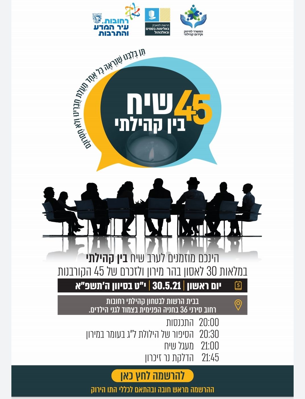 הערב יתקיים ביום ראשון, 30.5.21 , י״ט בסיוון ה׳תשפ״א, בבית הרשות לביטחון קהילתי רחוב סירני 36 (בחנייה הפנימית בצמוד לגני הילדים).
