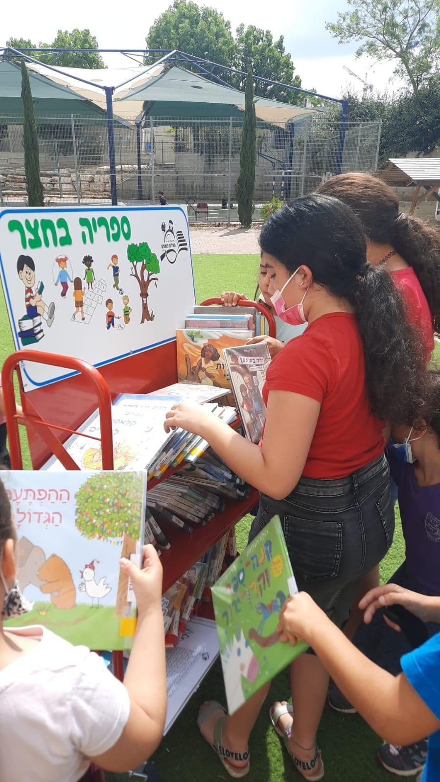 התלמידות והתלמידים נהנו מספריות ניידות הפזורות במרחב הבית ספרי במסדרונות ובחצר המשחקים,