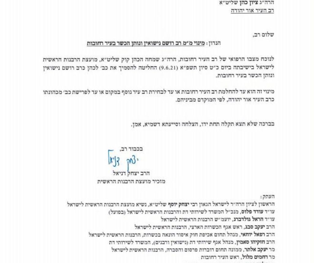 המינוי הזמני מעניק הסמכה לרב ציון כהן להיות רב רושם נישואין ונותן הכשר בעיר רחובות.