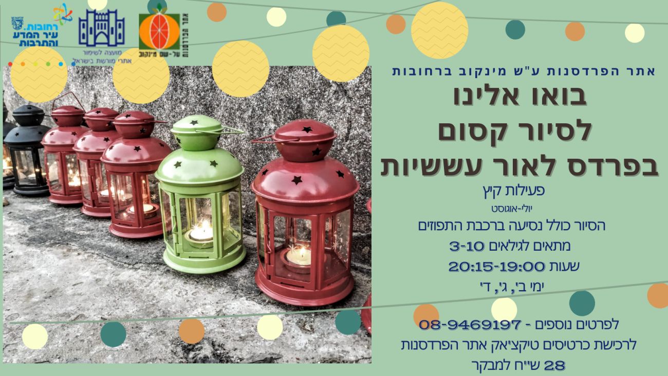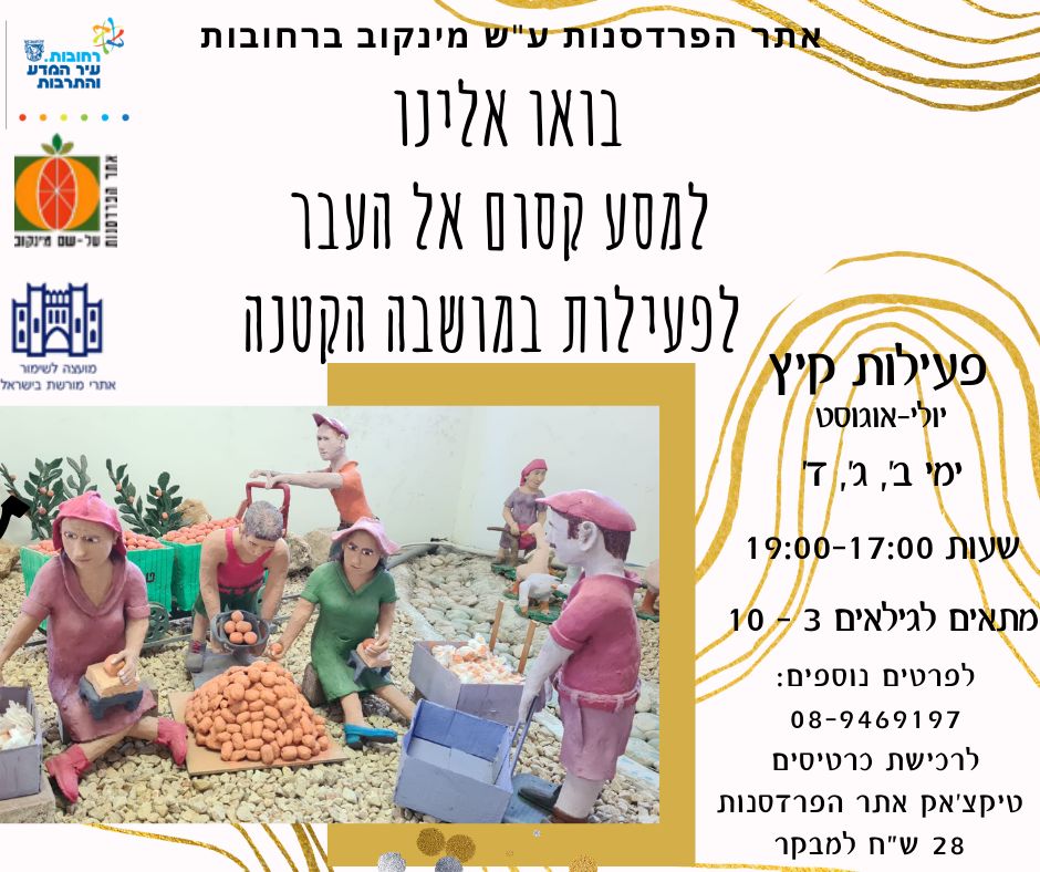 קיץ באתר הפרדסנות ברחובות! לאורך חופשת הקיץ בימים שני עד רביעי אתר הפרדסנות יפתח למשפחות עם סיורי עששיות וגן הפסלים החדש המלמד על ההיסטוריה הרחובותית