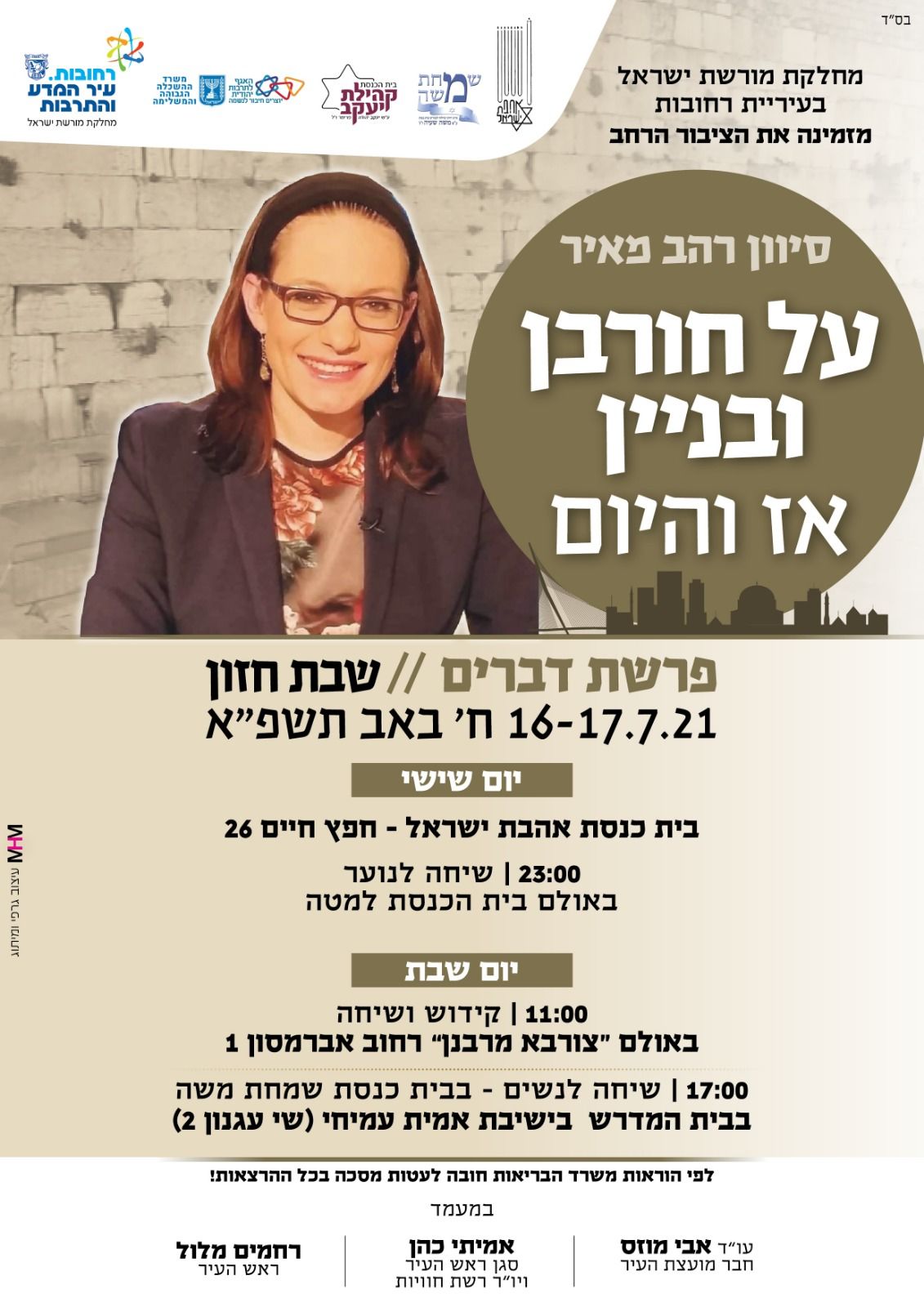 עיריית רחובות ומחלקת מורשת ישראל מזמינים את התושבים להרצאותיה של אשת התקשורת והעיתונאית סיוון רהב מאיר לרגל ט' באב. ההרצאות יתקיימו בימים שישי ושבת 16-17.7.21 בבתי כנסת בעיר בסימן "על חורבן ובניין- אז והיום"