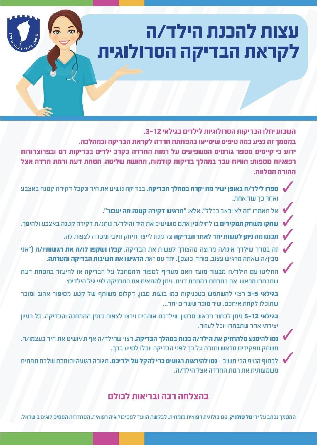 מאחר והילדים עושים את הבדיקה הזו בפעם הראשונה בחייהם - היא עלולה להלחיץ ולהפחיד אותם. בטרם ההגעה למתחם יש להכין את הילד/ה לקראת תהליך הבדיקה, זאת כדי להפחית את מד הלחץ והחששות. פיקוד העורף הכינו לכם מס' המלצות בתמונה