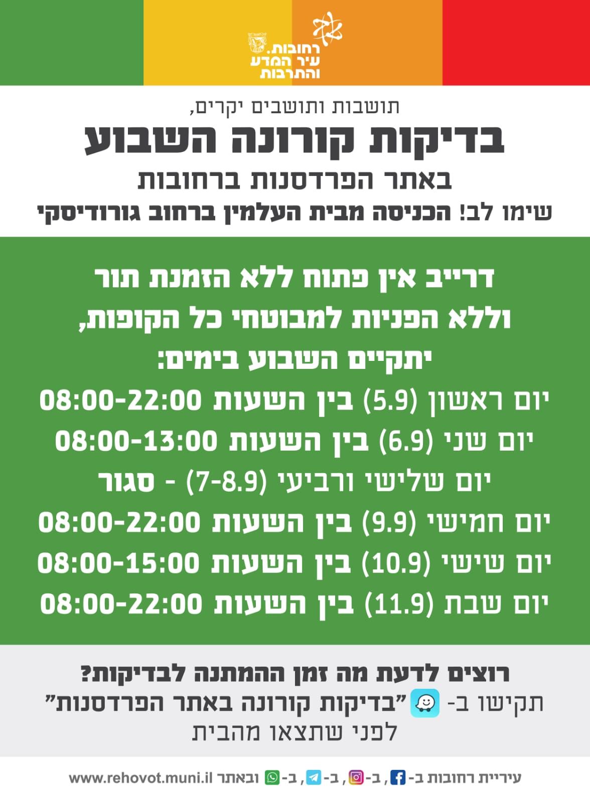 שימו לב, לאור מצב התחלואה, עיריית רחובות פותחת את מתחם הבדיקות באתר הפרדסנות גם בשבת הקרובה (11.9), ניתן להגיע למתחם הדרייב אין בין השעות 08:00-22:00 ולהיבדק.