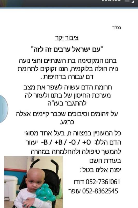 זוג צעיר מקרית עקרון פונה בפניה נרגשת בשם בתם נויה נועה. לסייע להצלת חייה של ילדה קטנה בת שנתיים וחצי הלוקה בלוקמיה. וזקוקה בדחיפות מידית לתרומת דם עבורה. תרומת הדם תסייע ועשויה לשפר את מצב מערכת החיסון של בתם ובעצם להתגבר על הזיהומים והסיבוכים שכבר קימיים בגופה הקטן כרגע. כל המעוניין לתרום דם עבור נויה נועה חייב להיות בעל אחד מסוגי הבאים -- / o+/ -o/ +b/.-b