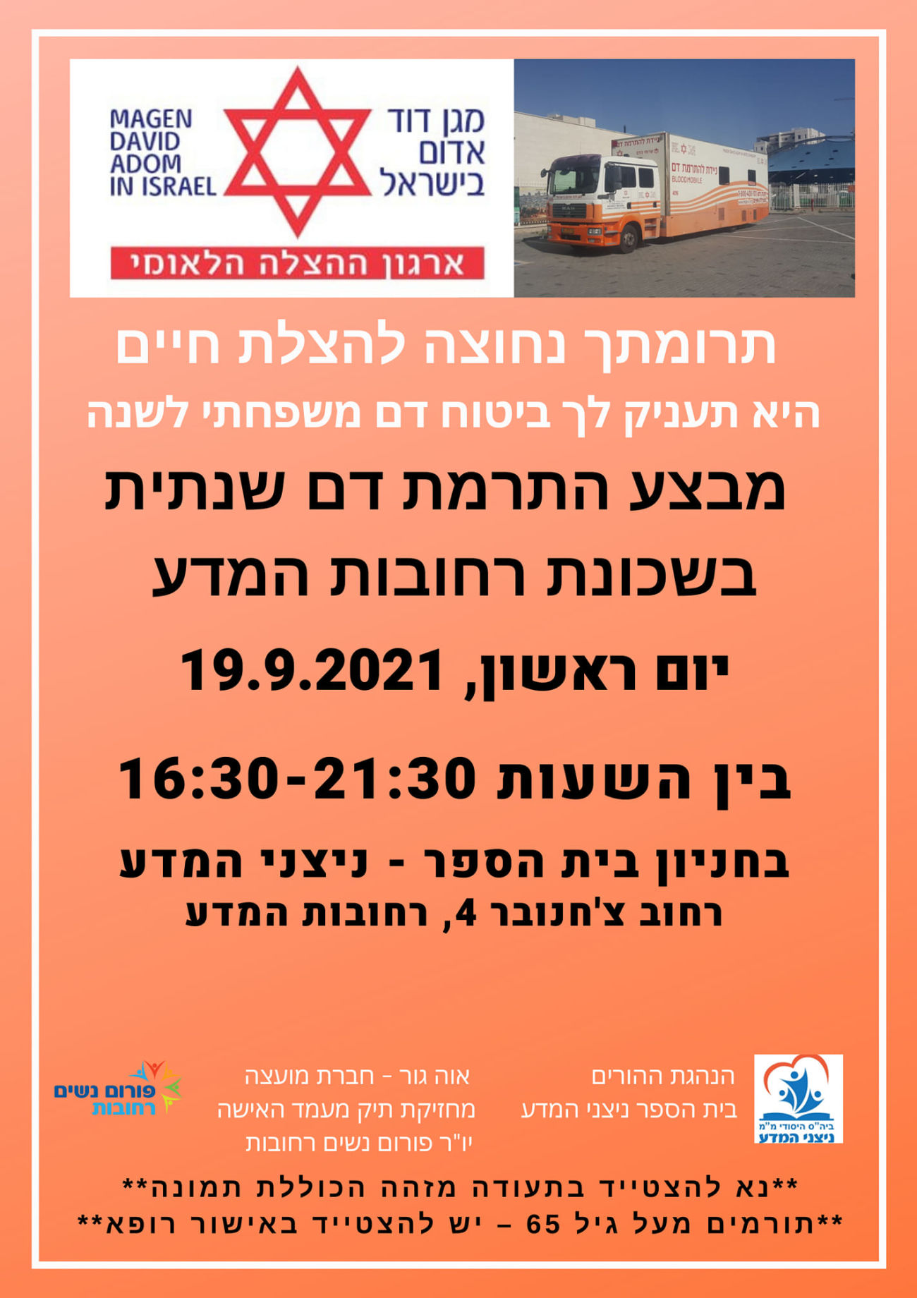 קהילת ביה"ס ניצני המדע ברחובות מזמינה את התושבים להציל חיים באירוע התרמת דם שיתקיים היום (ראשון 19.9) בחניון בית הספר