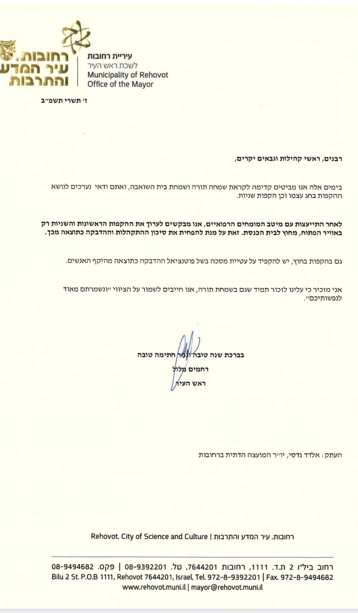 לפיכך, בימים אלה פנה ראש העיר במכתב לגבאים וראשי הקהילות בעיר, ובו ביקש מהם כי ההקפות שנערכות בשמחת תורה עם ספרי התורה, ייערכו רק מחוץ למבנה בית הכנסת, באוויר הפתוח.
