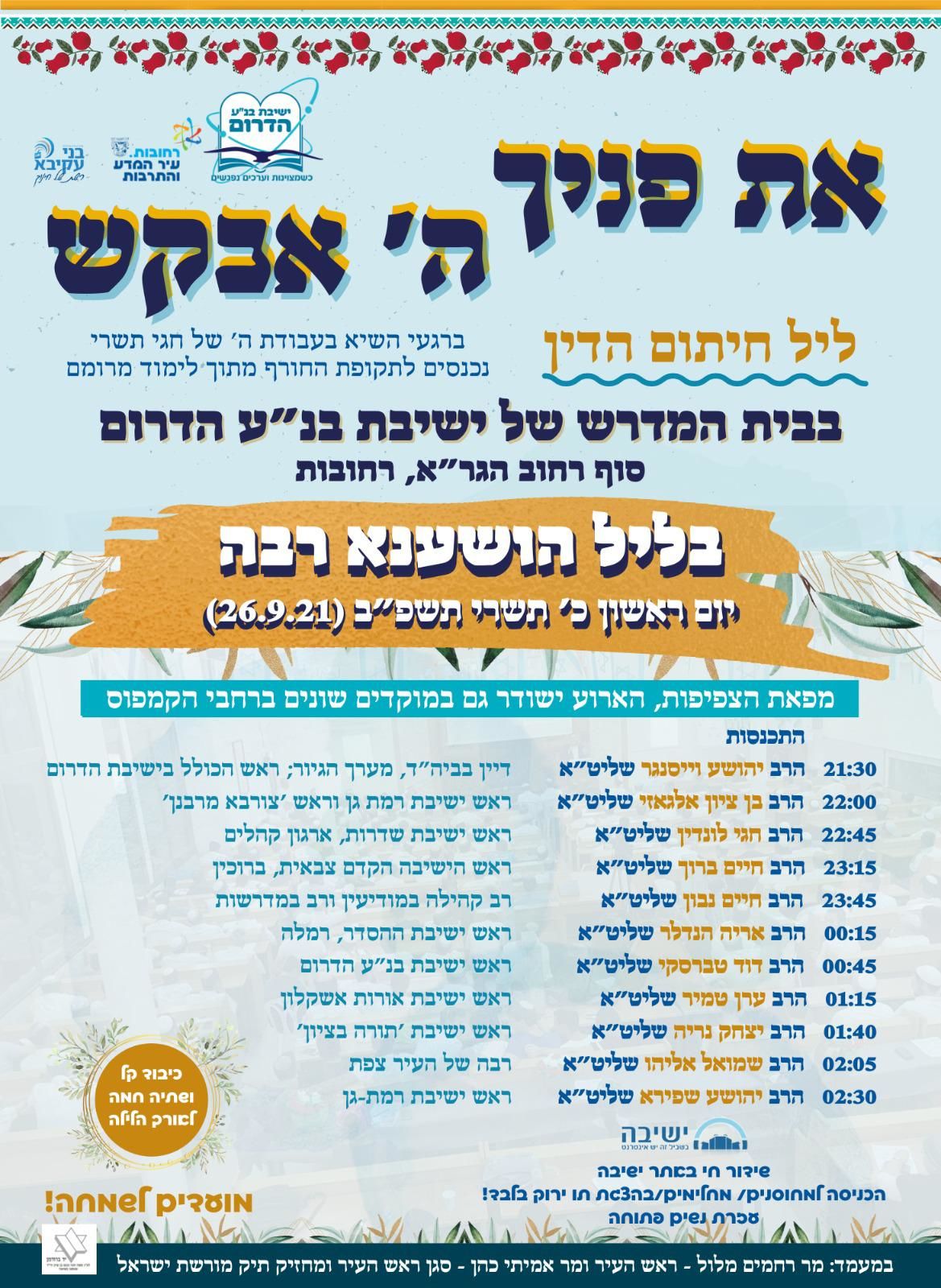 הציבור ברחובות מוזמן! ביום ראשון 26/9 החל מהשעה תשע וחצי בערב ועד 2:30 בלילה יתקיים בישיבת הדרום ברחובות מרתון של לימוד תורה עם רבנים ואישים