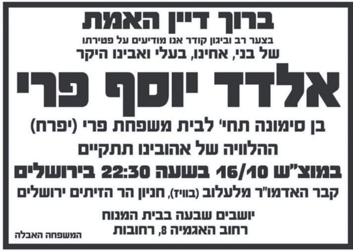 כנראה התפתחות משמעותית ברצח אלדד פרי ז"ל... ההלוויה הערב מוצאי שבת