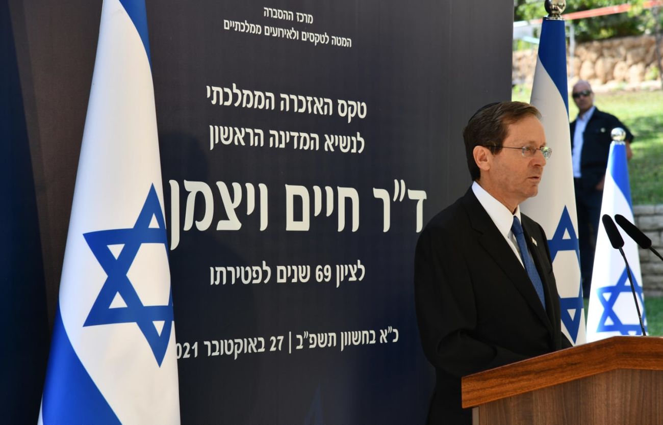נשיא המדינה יצחק הרצוג נשא דברים היום יום רביעי, כ"א בחשוון, 27 באוקטובר, בטקס האזכרה הממלכתי לנשיאה הראשון של מדינת ישראל ד"ר חיים ויצמן ז"ל, במלאות 69 שנים לפטירתו. הטקס התקיים באחוזת ויצמן ברחובות למרגלות קברו. בטקס השתתפו יושב ראש הכנסת מיקי לוי, שופטת בית המשפט העליון דפנה ארז ברק, משפחת ויצמן וסגן נשיא מכון ויצמן למדע פרופ' זיו רייך.
