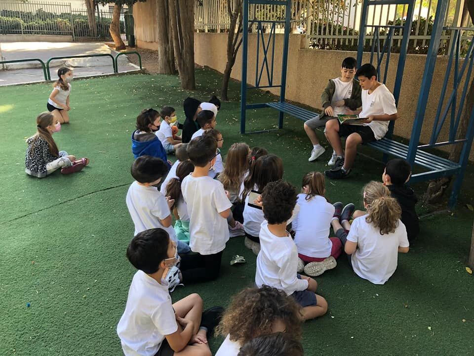 מדי יום שישי נאספים התלמידים בדשא ונהנים מסיפורי הילדים האהובים