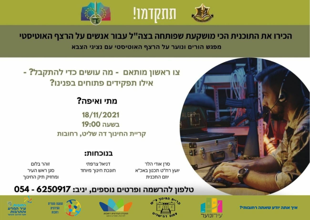 המפגש יתקיים היום חמישי 18.11.21 בשעה 19:00 בקריית החינוך דה שליט רחובות בהשתתפות: סגן ראש העיר מחזיק תיק החינוך, זהר בלום, חונכת חינוך מיוחד, דניאל צרפתי, ויוזם התוכנית, סרן אודי הלר, יועץ ראש חטיבת תכנון באכ"א.