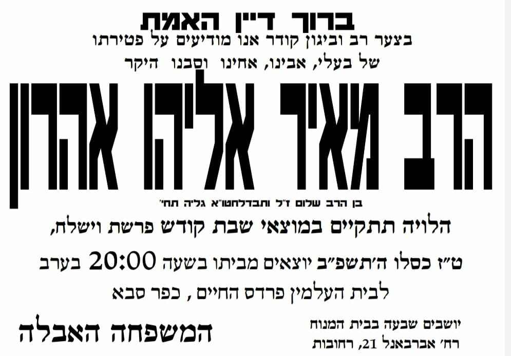 ביום שישי סמוך לשבת הלך לעולמו הרב הגדול מאיר אהרן לאחר מחלה קשה והוא בן 70. הלווייתו תצא היום מוצ"ש בשעה 20:00 רחוב אברבנאל 21 משם לבית הכנסת יד לשבים ומשם לבית כנסת חבד ומשם לבית העלמין כפר סבא.
