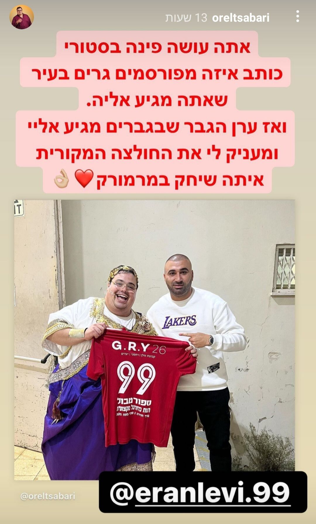 השחקן הרחובותי, אוראל צברי זכה להפתעה במהלך סיבוב הופעות חנוכה עם ההצגה "המכבים" כאשר שחקן מרמורק לשעבר ערן לוי העניק לו את החולצה איתה שיחק במועדון