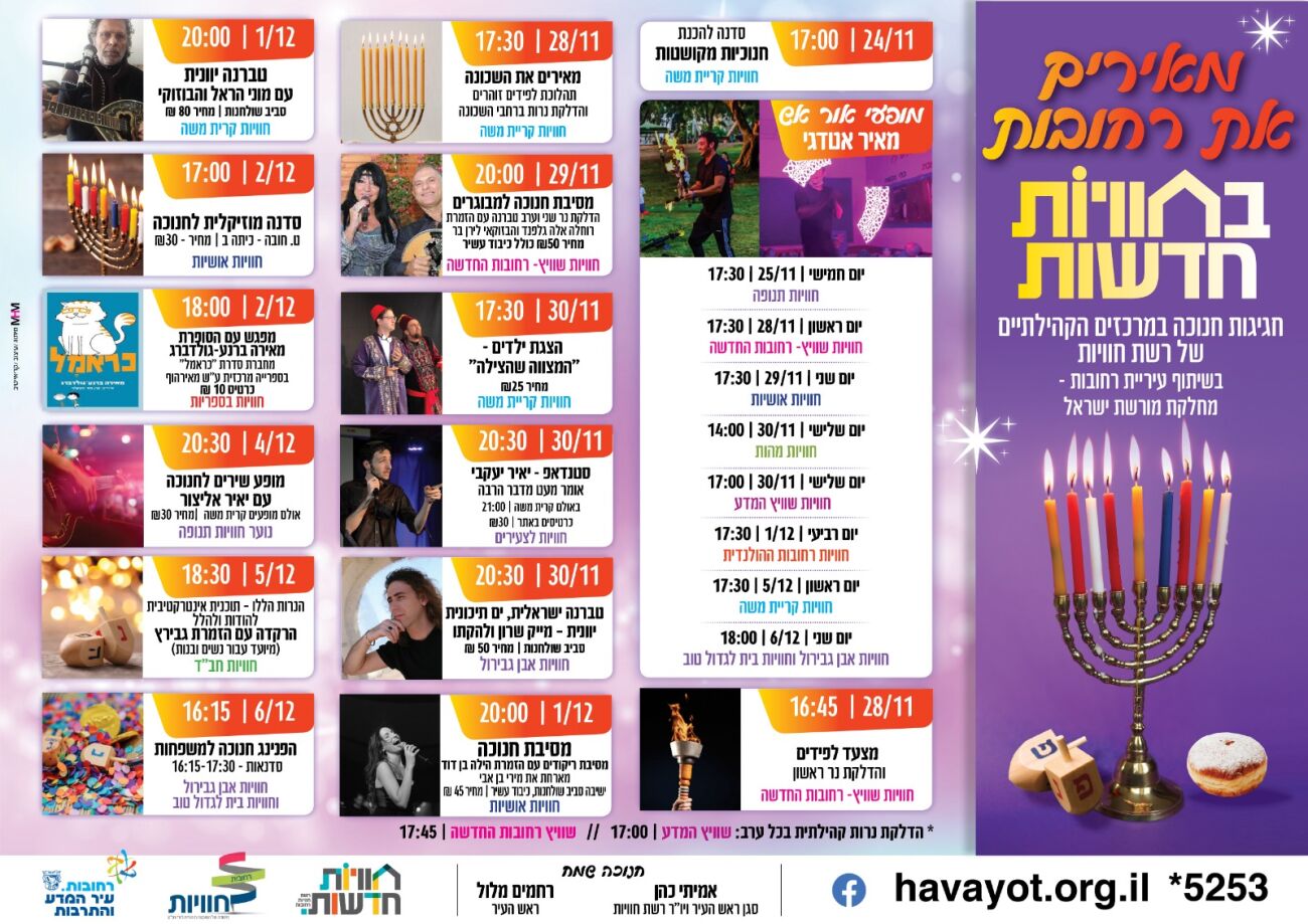 חג החנוכה יתקיים השנה בין התאריכים 28.11-6.12.21 ועיריית רחובות ריכזה עבור התושבים את מגוון הפעילויות ברחבי העיר לאורך כל שמונת ימי החג: מחזמר חנוכה, תיאטרון לילדים, טיולים בשטח, מופעי אור, קונצרטים ועוד עשרות פעילויות לילדים, נוער ולמשפחות יתקיימו בכל רחבי העיר בחג האורים. החברה העירונית, מחלקת הילדים והנוער באגף החינוך והנוער, הפלטפורמה – מרכז הצעירים העירוני, מרכז מורשת יהדות תימן וקהילות ישראל, רשת חוויות ועוד יקיימו אירועים ופעילויות במהלך ימי החג למען כל התושבים.